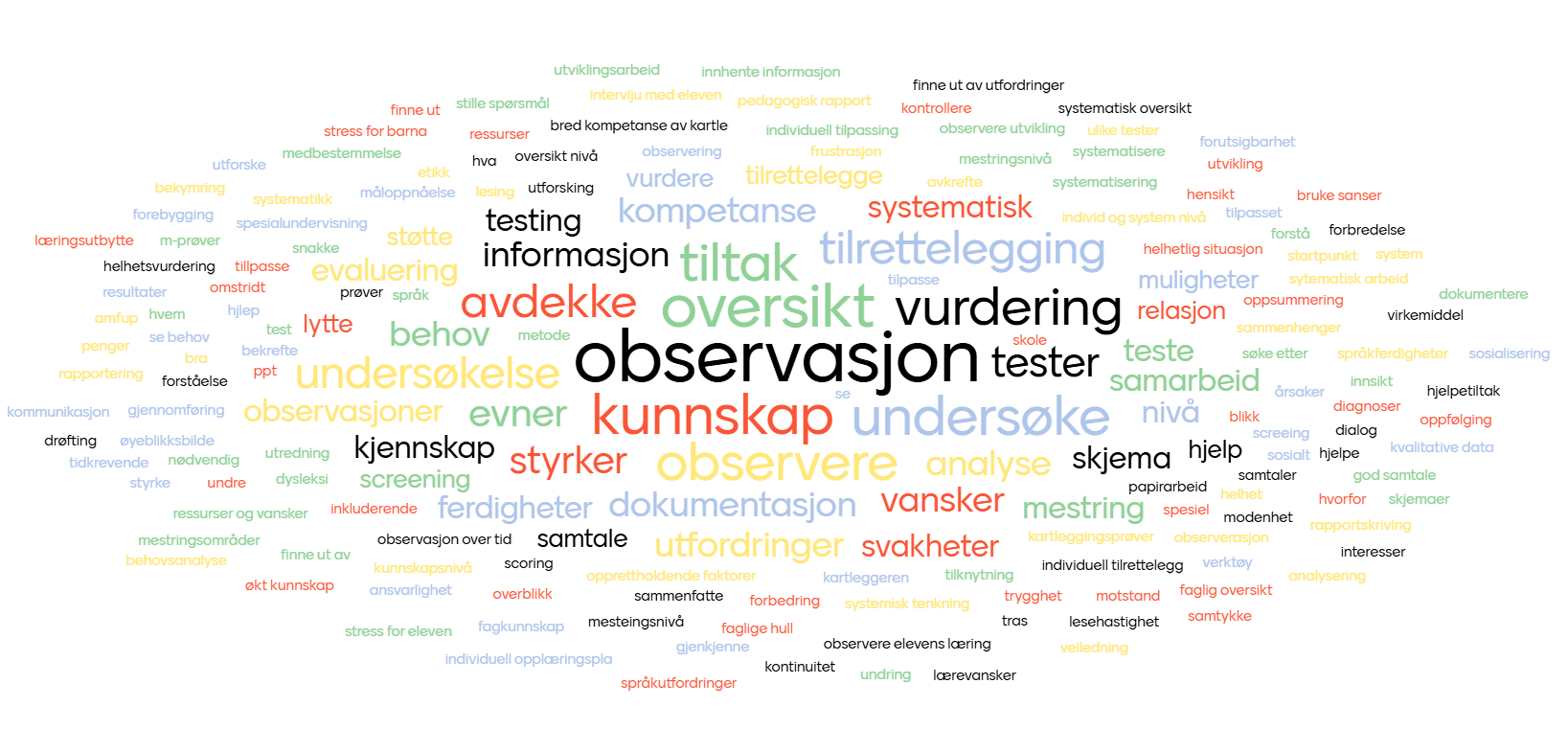 Ordskyen under illustrerer hva studenter i spesialpedagogikk forbinder med begrepet "Kartlegging". Du bidrar til ordskyen ved å trykke på denne lenken. eller gå til menti.com og skrive inn koden under. Dette er ment som en slags aktivering av forkunnskaper til tematikken og for å undersøke hvilke konnotasjoner man har til begrepet.